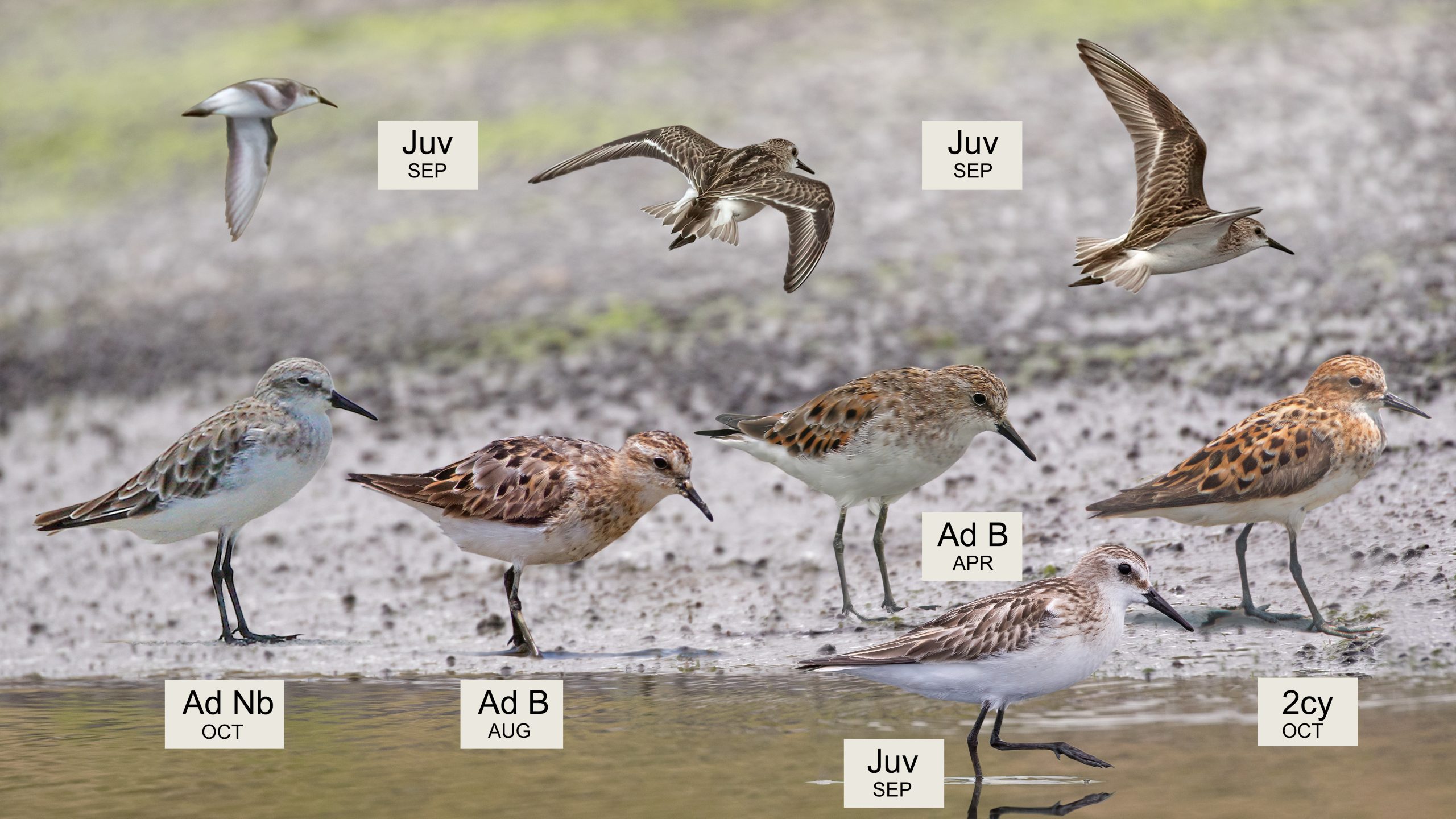 Plump, small-headed, fine-billed, relatively long-legged stint. Important structural features in all plumages include long, thin legs; slightly decurved bill tapering to a fine point; small head and sloping forehead giving a ‘snouty’ expression; rounded body shape and ‘humped shoulders’; somewhat upright stance with head sitting on top of body. In flight, very similar to Red-necked Stint, but more pronounced dark leading edge to underwing. Ad B: (Apr – Aug) Head chestnut, streaked darker on crown and nape, dark lores and whitish supercilium; throat unmarked white; breast sides chestnut with blackish streaks throughout, whiter but still streaked in central breast; belly, flanks and vent umarked white. Scapulars, tertials and wing coverts black centres and broad, well-demarcated chestnut fringes, paler at tip.In worn plumage a split supercilium may be prominent, and chestnut areas may become yellowish or straw-coloured. Ad Nb: (Sep – Mar) Plumage very similar to Red-necked Stint, but supercilium weaker over eye, and may taper toward a point at rear edge. Overall, upperparts feathers are darker, smoke-grey with more prominent dark centres than on typical Red-necked. Underparts below breast are unmarked white. Best identified with help of structural features. Juv: (Aug – Oct) Central crown dark, contrasting with paler sides; sides of breast buff with distinct darker spots or streaks; mantle, scapulars, wing coverts and tertials are uniformly blackish-centred with well demarcated buff fringes. Pale lines on mantle edge prominent.