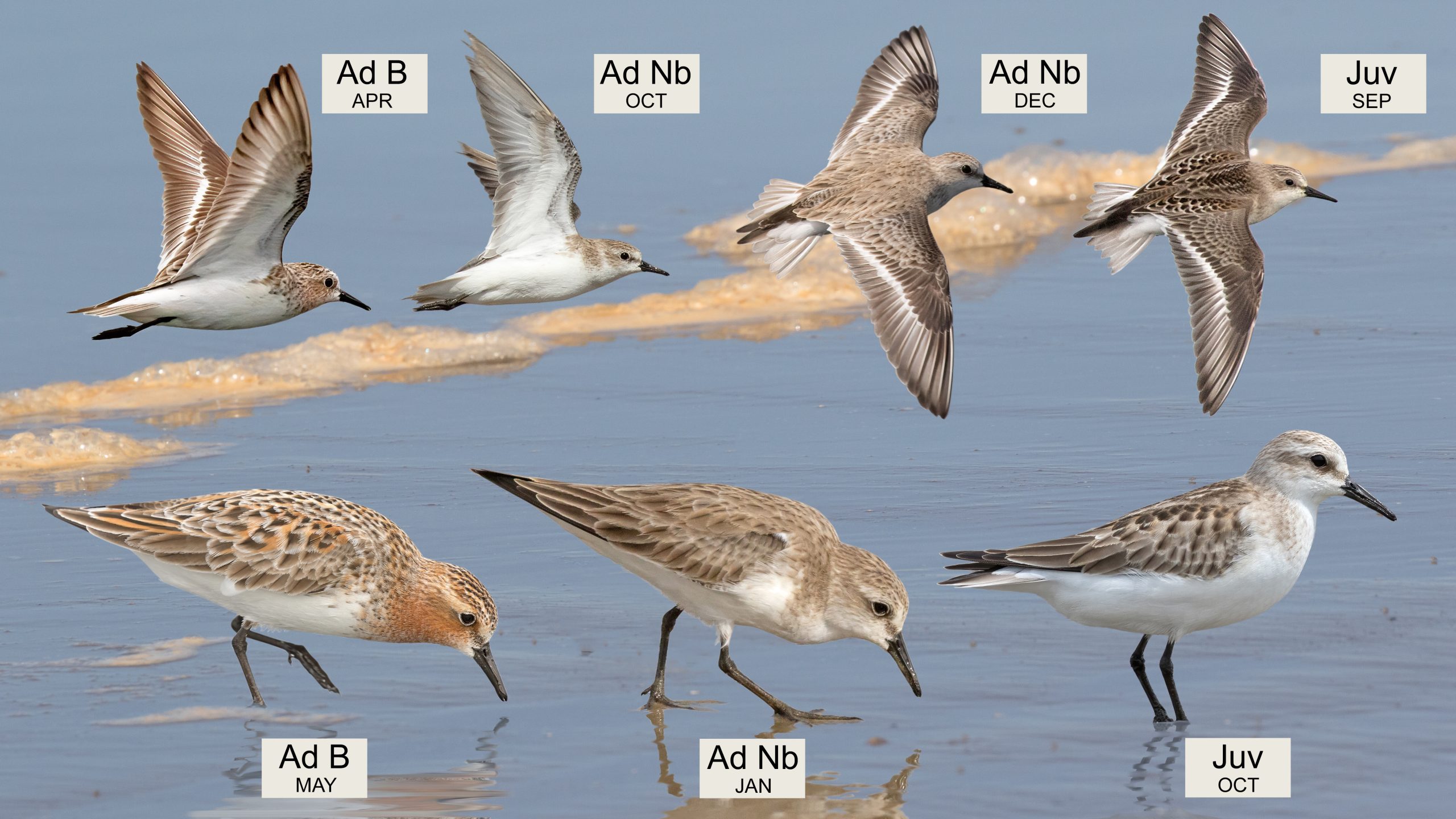Long-bodied, black-legged stint most numerous on intertidal mudflats. Appears large-headed and neckless, has a flat back profile and a long rear-end; a horizontal posture and relatively short legs. In flight, from above, thin mid-wingbar, dark central rump and tail, and grey outer tail feathers. From below, white underwing coverts; leading edge not conspicuously dark. Ad B: (Mar – Sep) Streaked crown, nape, ear coverts, throat and breast brick pink-rufous; lores darker; forehead, chin and supercilium variably whiter. Necklace of dark streaks along lower edge of breast; belly, flanks and vent white with some blackish shaft streaks on rear flanks and vent. Mantle may show indistinct cream line along edge; scapulars, variable number of tertials, and occasionally inner greater coverts have dark centres and rufous edges; remainder of wing coverts have darkish centres and indistinctly paler brownish edges. Ad Nb: (Sep – Feb) Crown, nape and ear coverts pale grey streaked darker; lores darker; supercilium, eyering, chin and throat whiter. Breast, especially sides, has variable grey streaks; belly, flanks and vent white, sometimes with darker shaft streaks on flanks and vent. Mantle, scapulars, coverts and tertials pale grey with darker shaft streak and whitish edges when fresh. Juv: (Sep-Oct) Central crown streaked brown, becoming gradually paler toward edge of crown; nape and ear coverts pale brown; lores darker and supercilium whiter. Chin and throat white; breast indistinctly streaked at sides, unstreaked with cream or grey wash in centre. Belly, flanks and vent unstreaked white. Upper scapulars have dark centres and variably ginger – chestnut edges and white tips; lower scapulars, tertials and wing coverts plain grey-brown with dark shaft streaks and indistinctly paler edges.