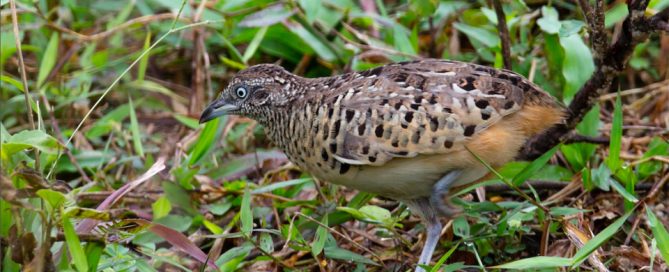 Widespread resident buttonquail in all Peninsular Malaysia states, favouring grassland, agricultural landscapes, including plantations. Not recorded from Bornean Malaysia. Told from other buttonquails by grey legs. Female, which is significantly larger than male, has black throat. Both sexes have white iris, large black and buff spots on breast and upperparts, and rich chestnut vent.
