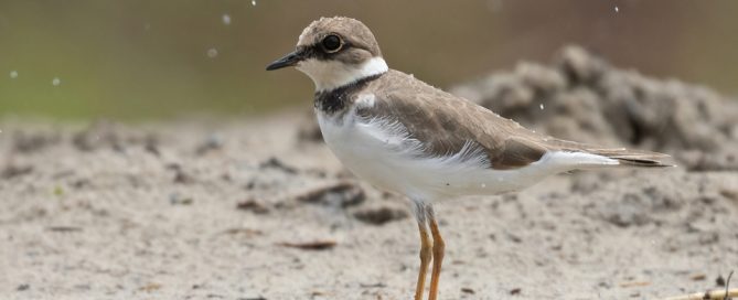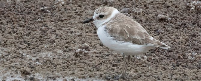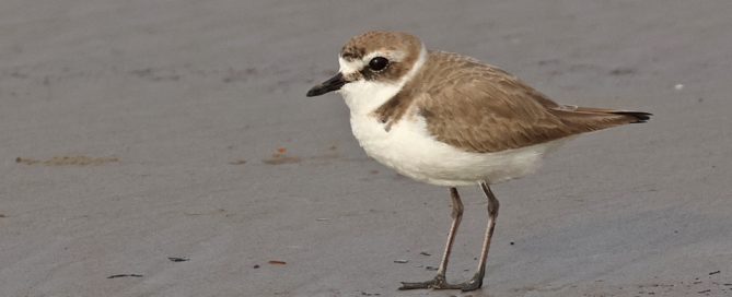 Small plover with white collar, plain pale brown upperparts. Shorter legs than sand-plovers. Breastband usually incomplete.