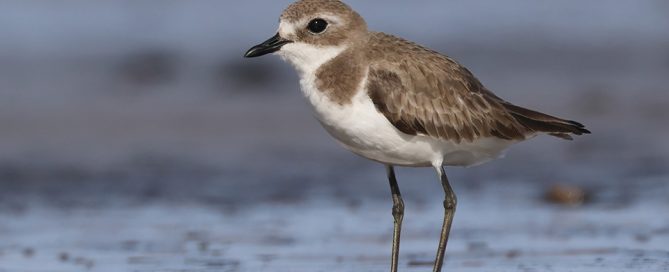 Similar to Kentish Plover, but heavier-billed and paler above, with shorter lateral breast patches, broader white nuchal collar; lores and lower ear coverts mostly white.