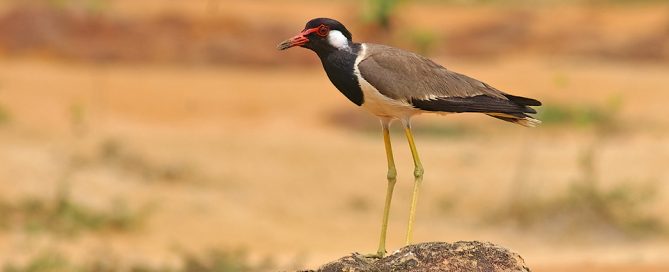 Large, noisy, elegant, boldly-coloured lapwing with very long, yellow legs and red facial skin and bill base.
