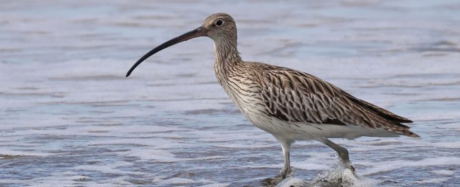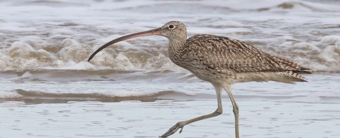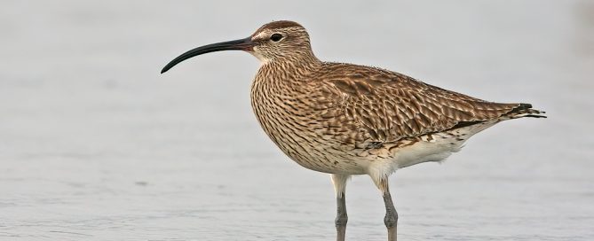 Very large, mid-brown shorebird with very long, downcurved bill. In flight, white rump and back and unmarked white underwing coverts are diagnostic