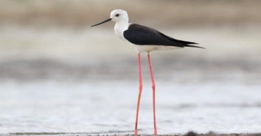 Medium-sized black-and-white shorebird with extremely long pink legs.