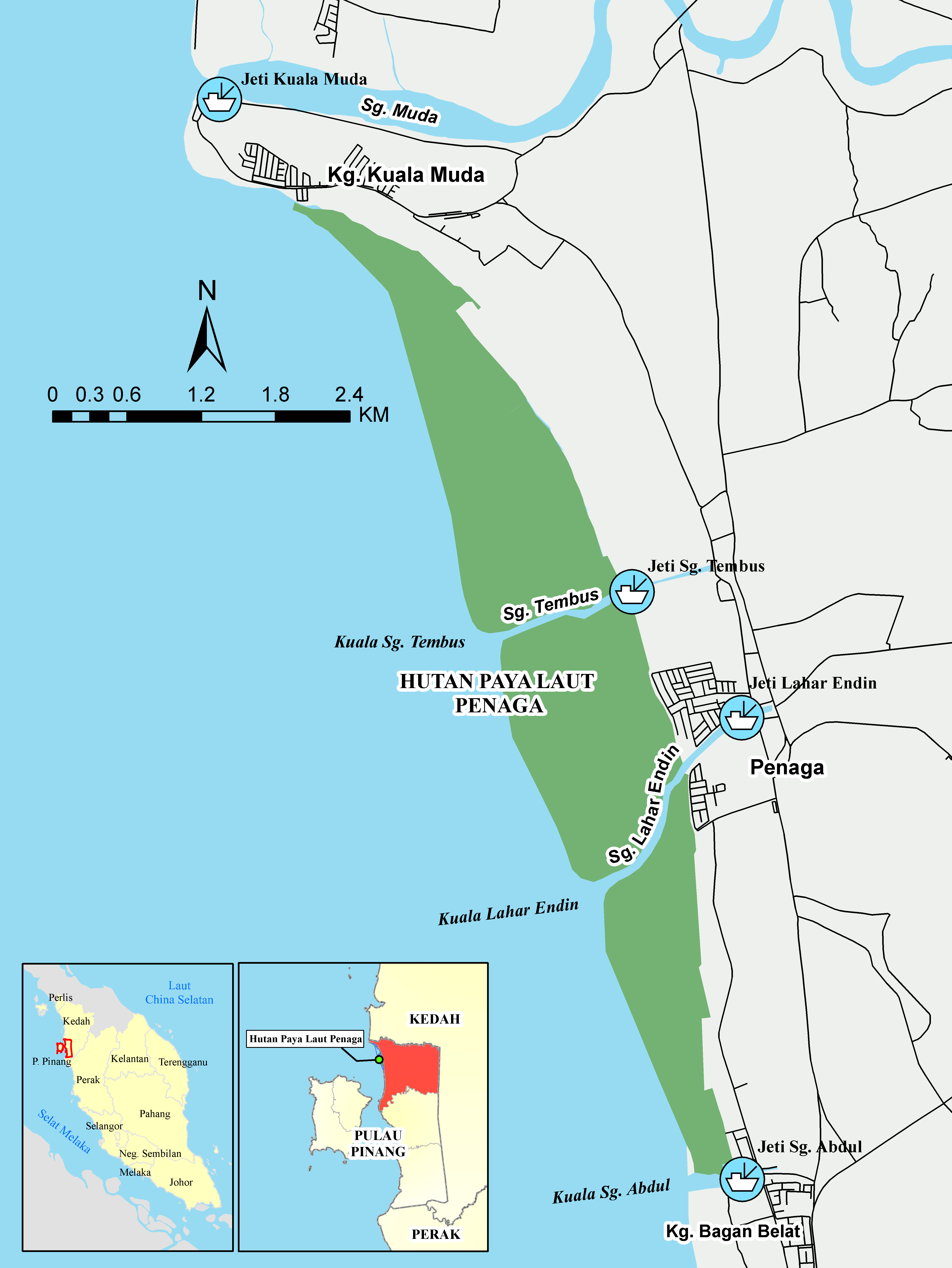 Teluk Air Tawar-Kuala Muda (TAT-KM) is located in Penaga, Seberang Perai Utara, Penang. This ecosystem consists of mangrove forests, tidal mud flats, and diverse species of fauna and flora. This mangrove forest is the largest and the only remaining that has not yet been affected by development in Penang. Avicennia marina trees dominate the forest zonation on the sea coast, followed by Sonneratia alba and Sonneratia ovata. In landward zones there are Rhizophora apiculata, Brugueira cyclindrica and Brugueira parviflora, while exposed areas are overgrown with Acanthus sp. and Acrostichum sp.